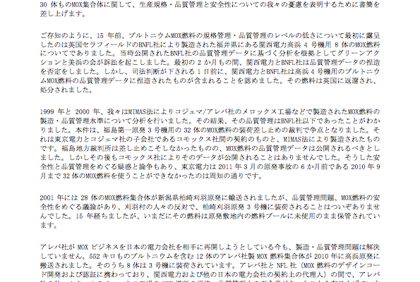「我々は、高浜原発での使用が間近に迫った30体のMOX燃料集合体の品質管理データの即時公開を求めます。」と結んでいます。