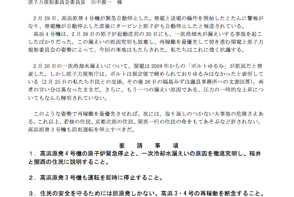 3月1日:関西電力、原子力規制委員会への要請書 高浜原発4号機の原子炉自動停止事故に抗議する