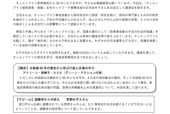 チェルノブイリ原発事故から30年になりますが、今もなお健康被害は続いています。今回は、「チェルノブイリ被害調査・救援」女性ネットワーク事務局長の吉田由布子さんをお迎えして講演会を開きます。