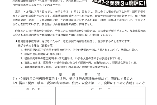 Home » アクション » 署名にご協力を40年超えの老朽原発高浜1・2号、美浜3号は廃炉へ