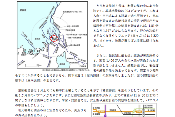 さらに、琵琶湖に最も近い原発が美浜原発です。関西1,400万人の命の水源が汚染されれば取り返しはつきません。避難計画では、要援護者の避難手段も決まっておらず、安定ヨウ素剤をすぐに入手することもできません。熊本地震は「屋内退避」の危険を示しましたが、国の避難計画の基本は「屋内退避」のままです。