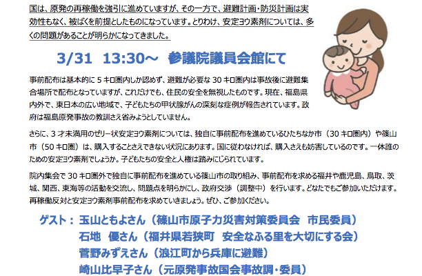 チラシダウンロード:3/31原子力防災・避難計画 ヨウ素剤の事前配布を求める 院内集会&政府交渉(PDF)
