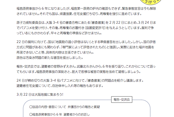 ダウンロード:3月22日:国相手の大飯原発3・4号止めよう裁判(大阪地裁) 傍聴席をいっぱいにして再稼働許さない!と示そう(PDF)